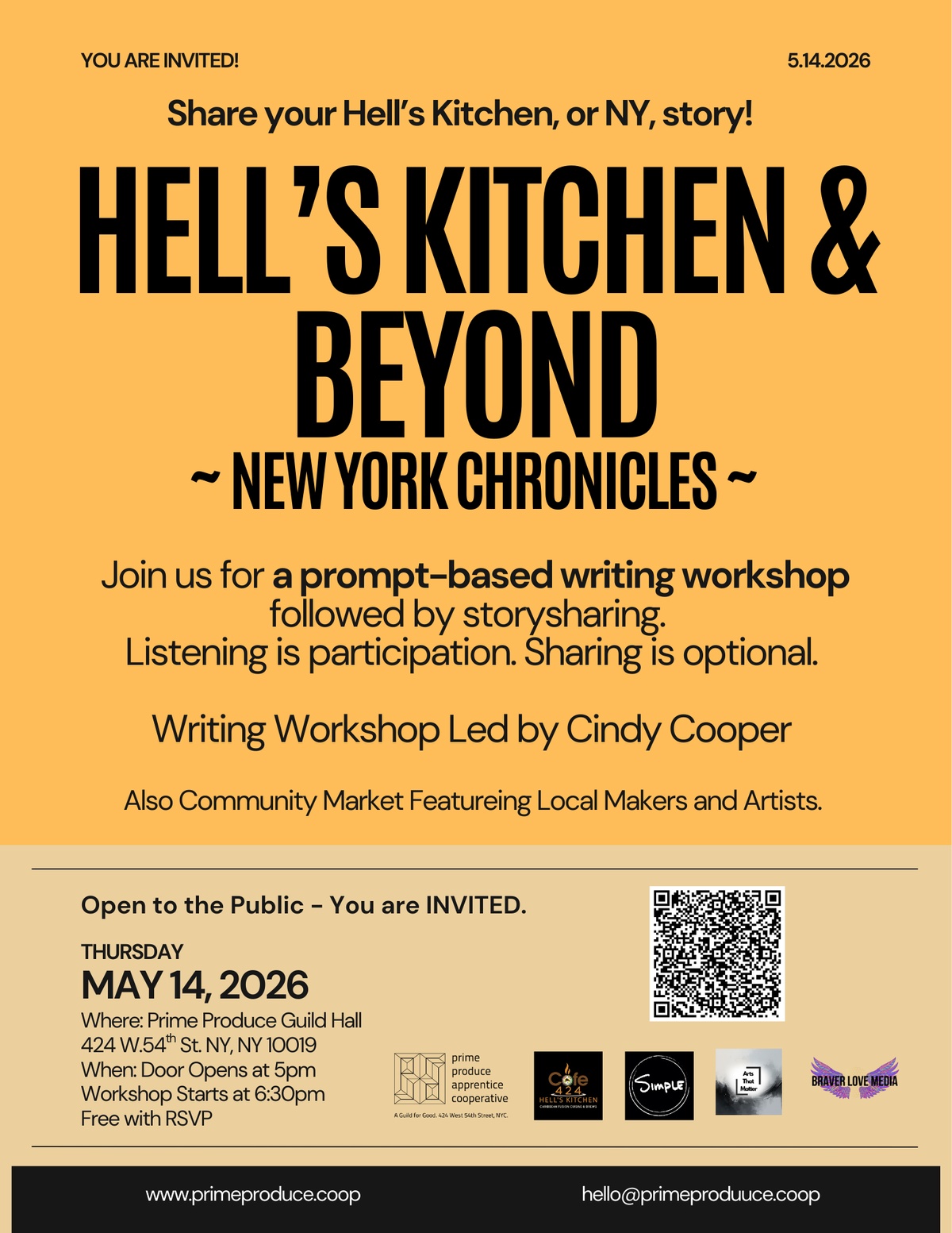 Hell's Kitchen is full of characters and stories. What's your Hell's Kitchen Story that you want to share? Writer Cindy Cooper (Words of Choice, Repro Freedom Arts) will be leading a writing workshop under the theme of "Hell's Kitchen (and New York)". Workshop folled by storysharing. Listening is participation. Sharing is optional.